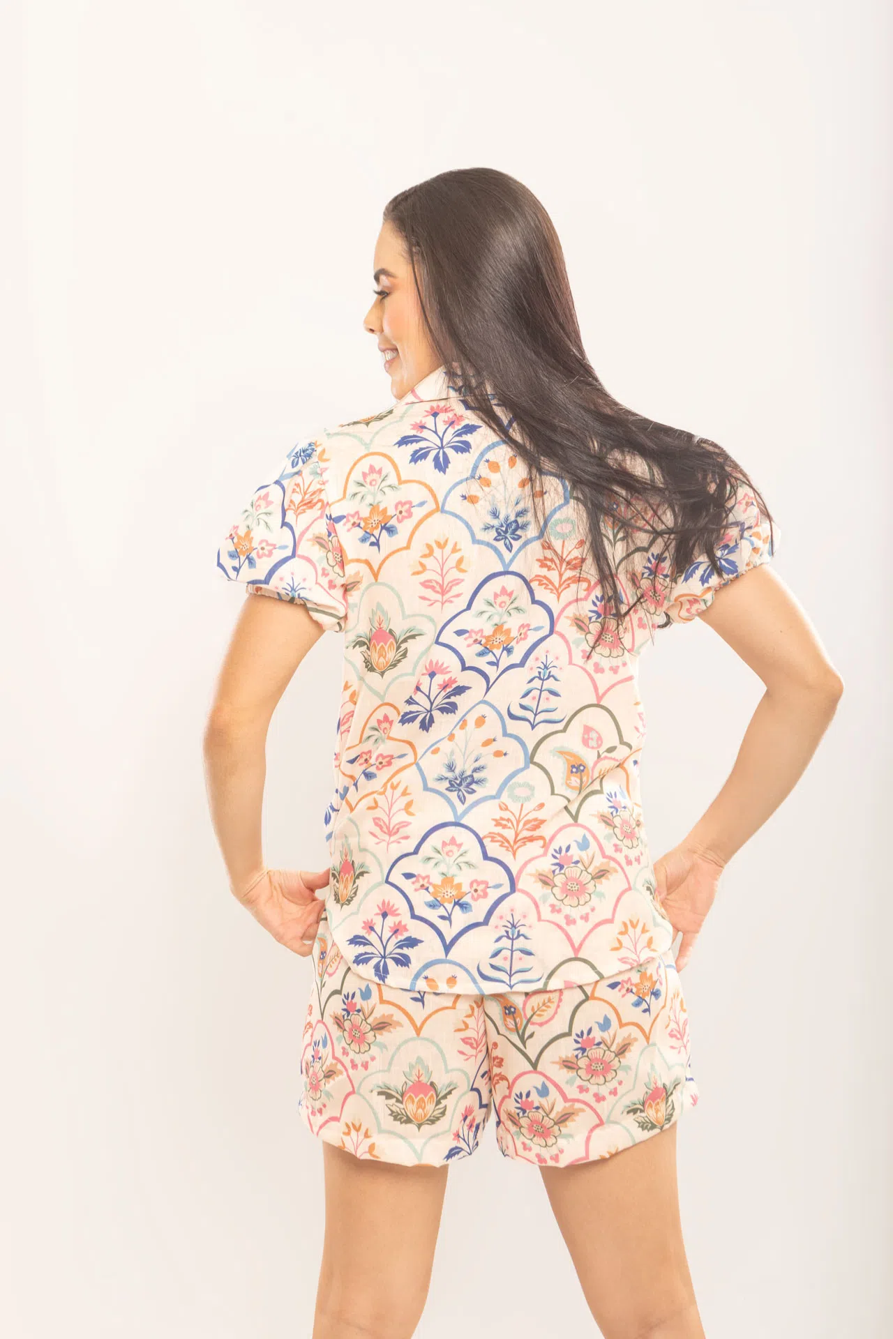 Set en lino olan con camisa de mangas cortas englobadas y short a media pierna con elástico trasero.