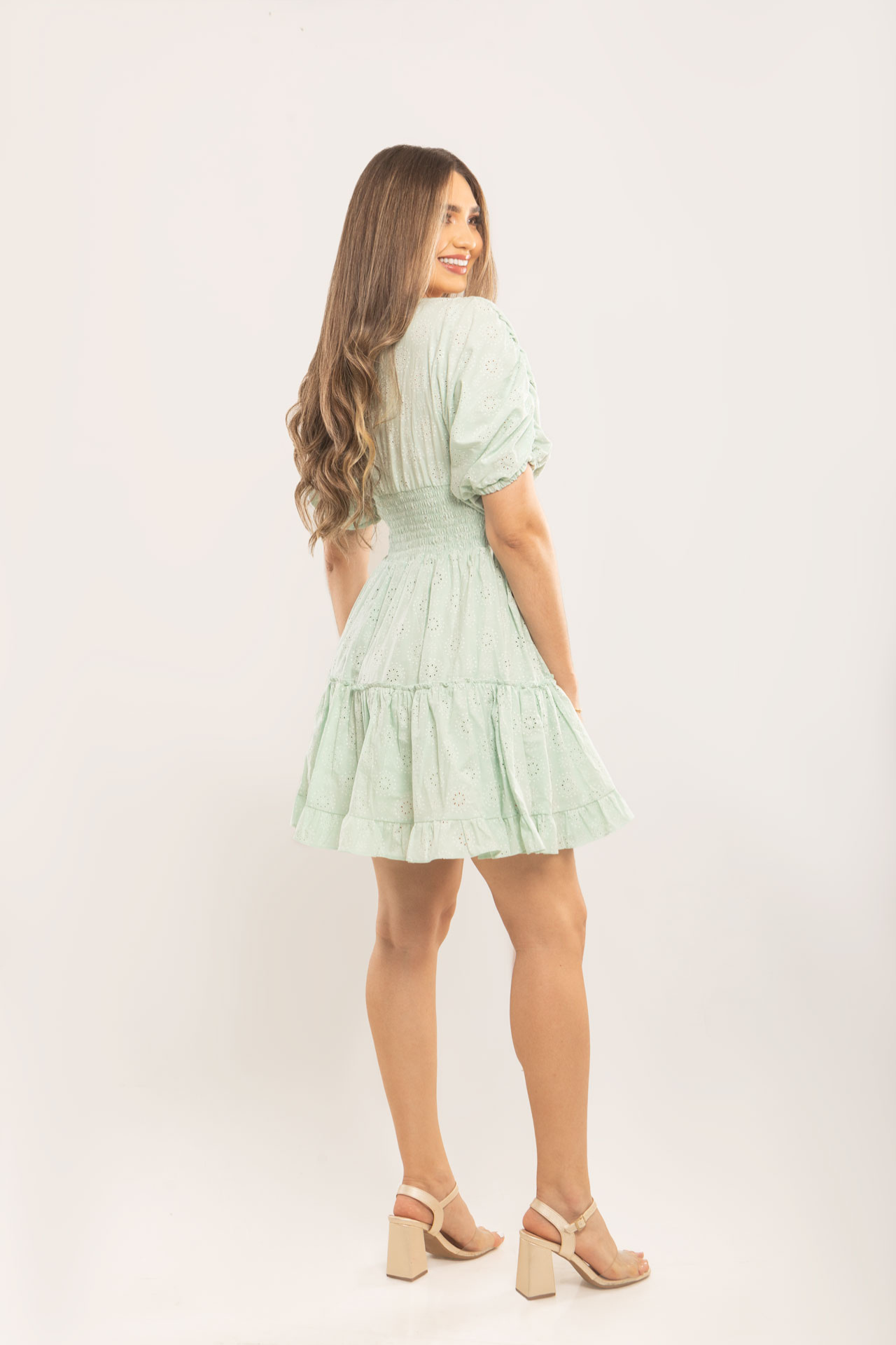Tela ojalillo puff con escote en V, fruncido en la cintura y mangas abullonadas.