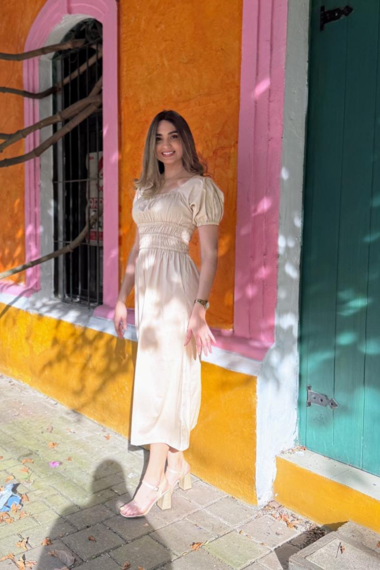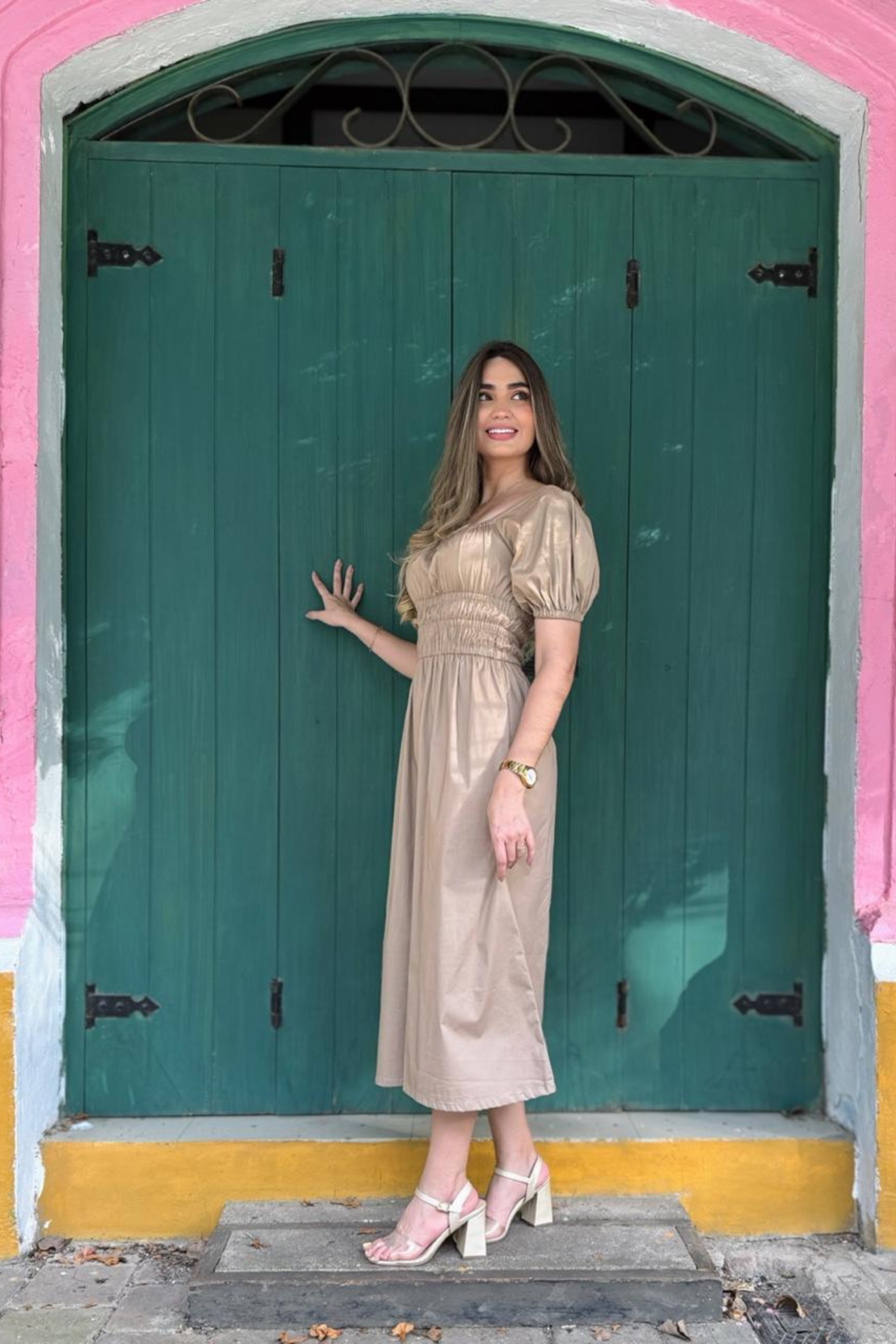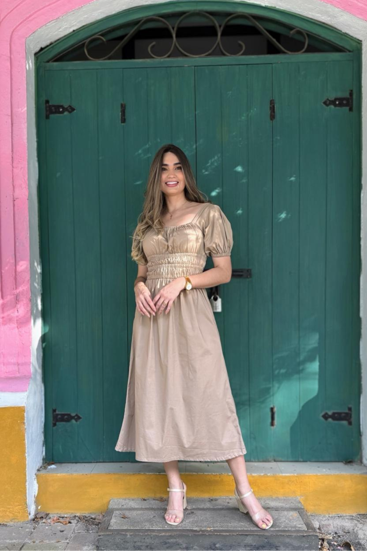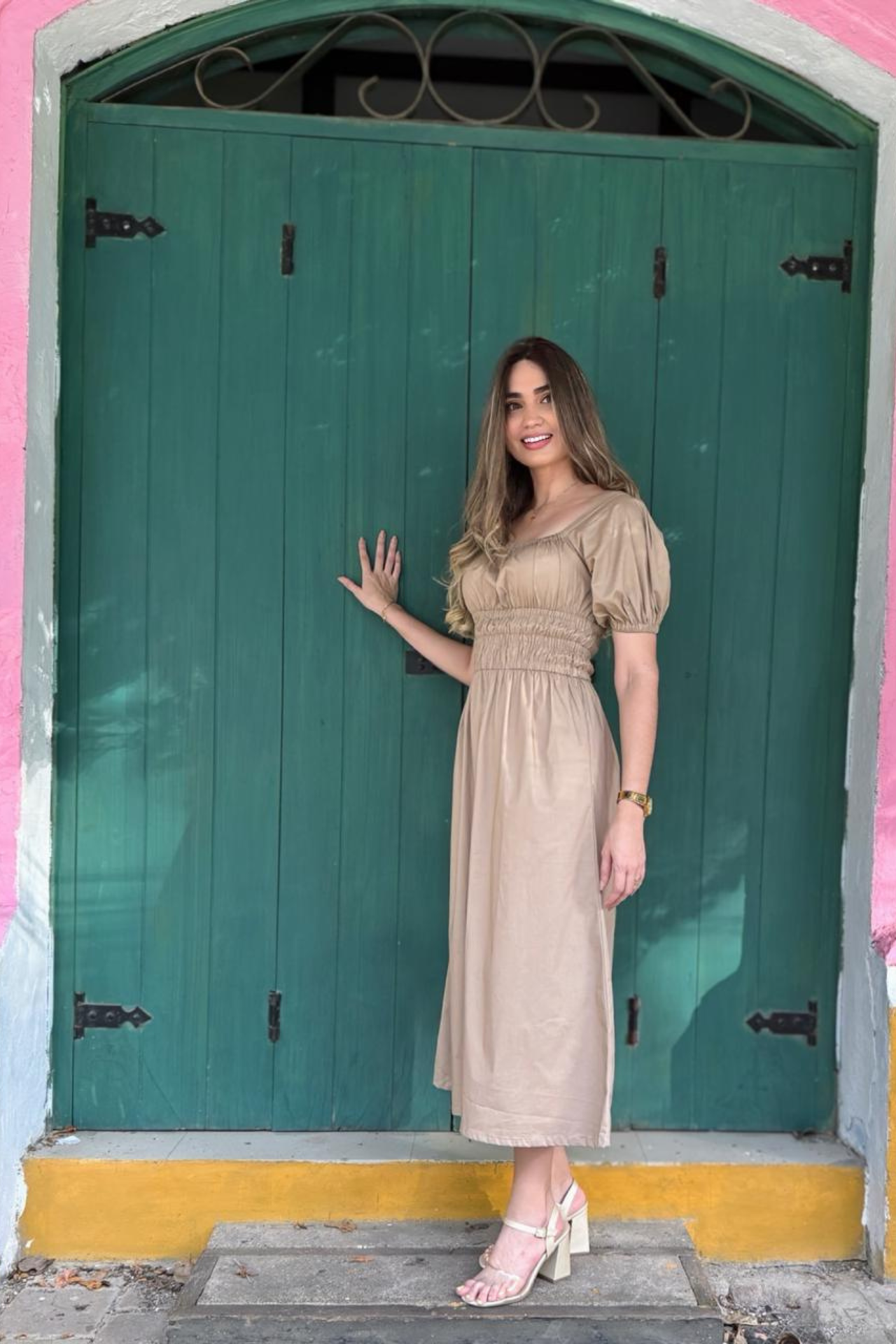 Vestido largo confeccionado en popelina, con corte a la cintura y doble elástico que realza la silueta y aporta comodidad.
